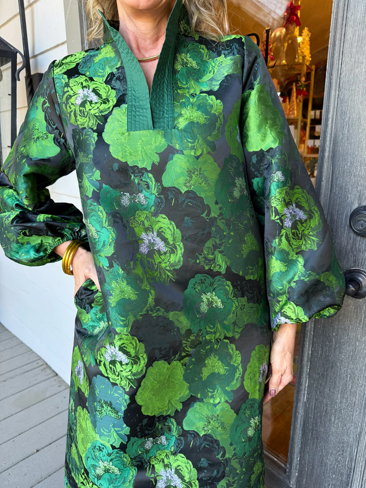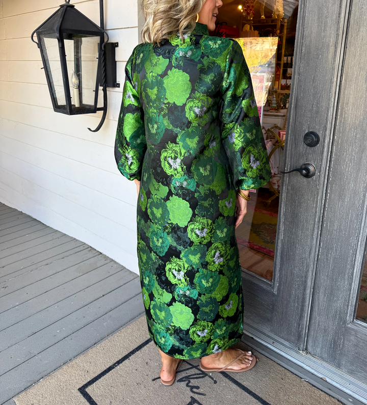Step out in style with the Maggie Maxi Dress—a playful blend of vibrant green hues and multicolored jacquard print.