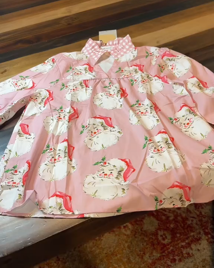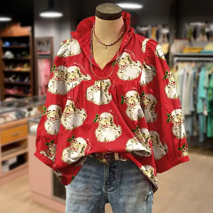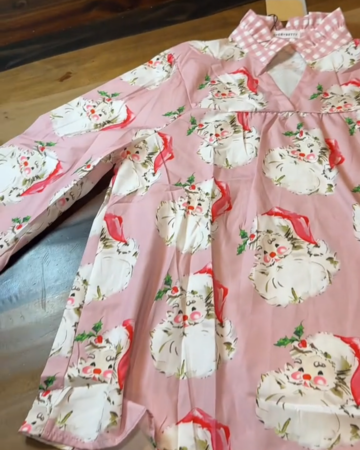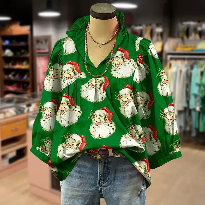 Christmas Santa Print Ruffle V-neck Long Sleeve Women's Top brings holiday cheer. This blouse features a charming ruffle V-neckline and long sleeves, ideal for cozy Christmas days.
