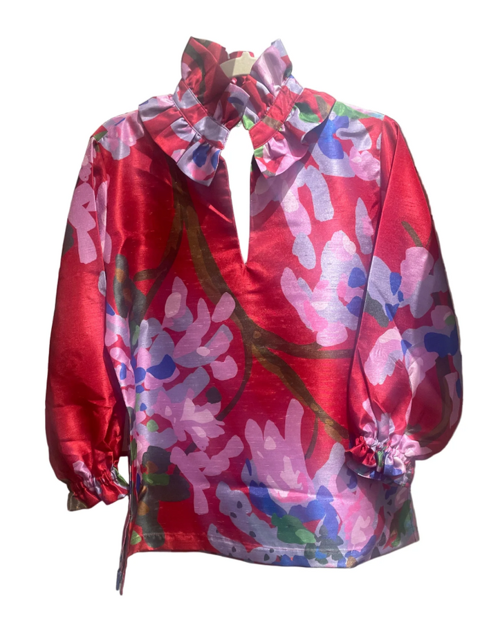 This top is dressed for the season in a festive red with a collection of florals in violet and blue. It is constructed of a polished poly shantung fabric and perfect for all events for the Christmas season.