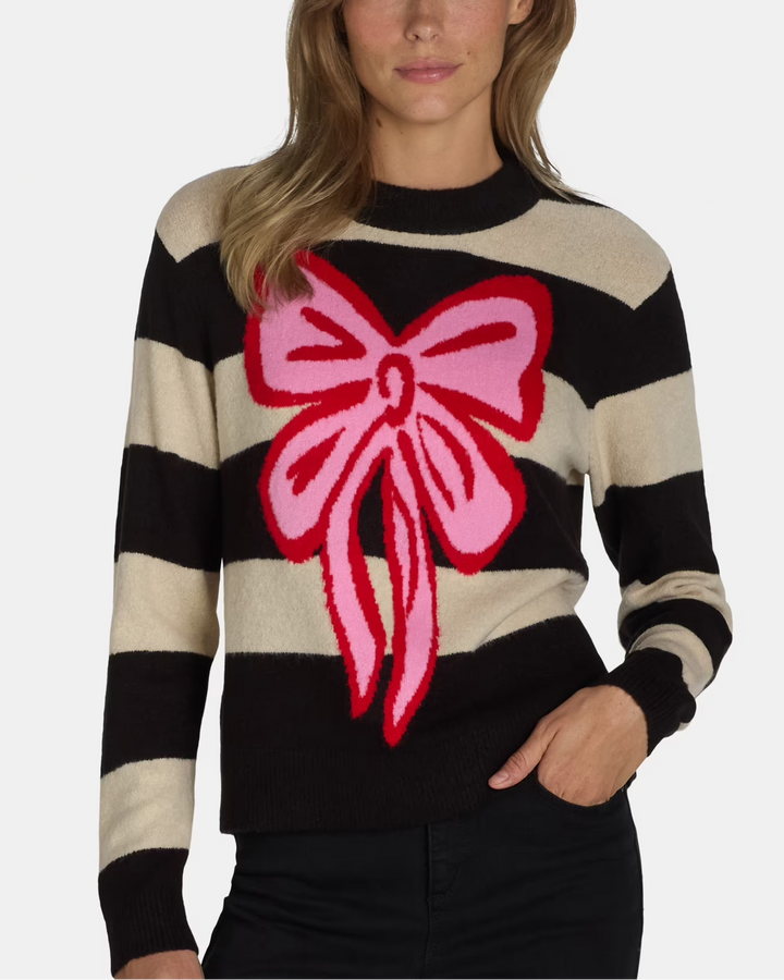 Cute, cozy and all wrapped up with a bow, Striped Sweater has got you covered when there’s a dip in the temps. A classic striped pattern, a comfy, relaxed fit and a colorful bow in the middle of it all, set this sweater apart from your everyday picks. Slip it on with jeans when the weekend is calling or pair it with trousers for an updated office look.