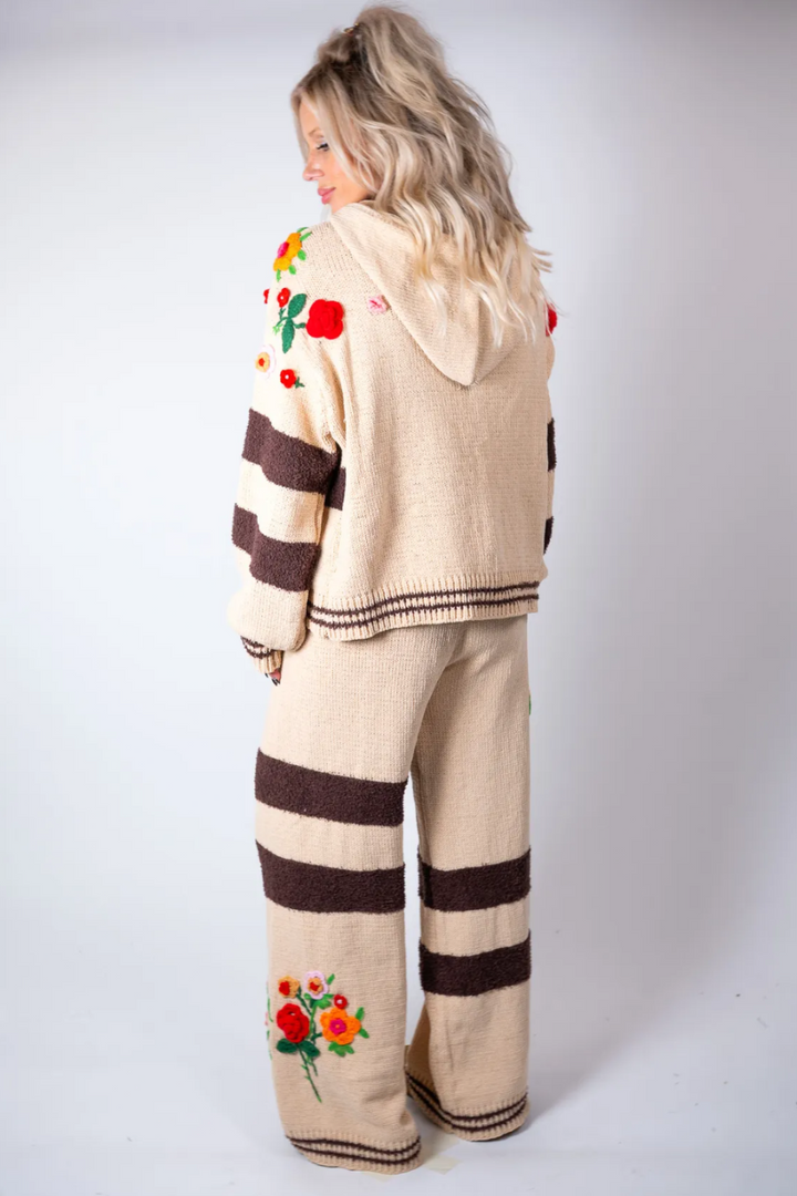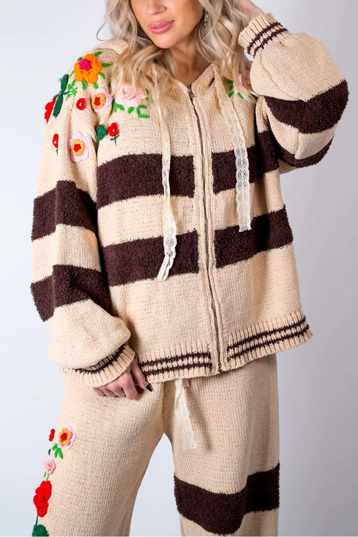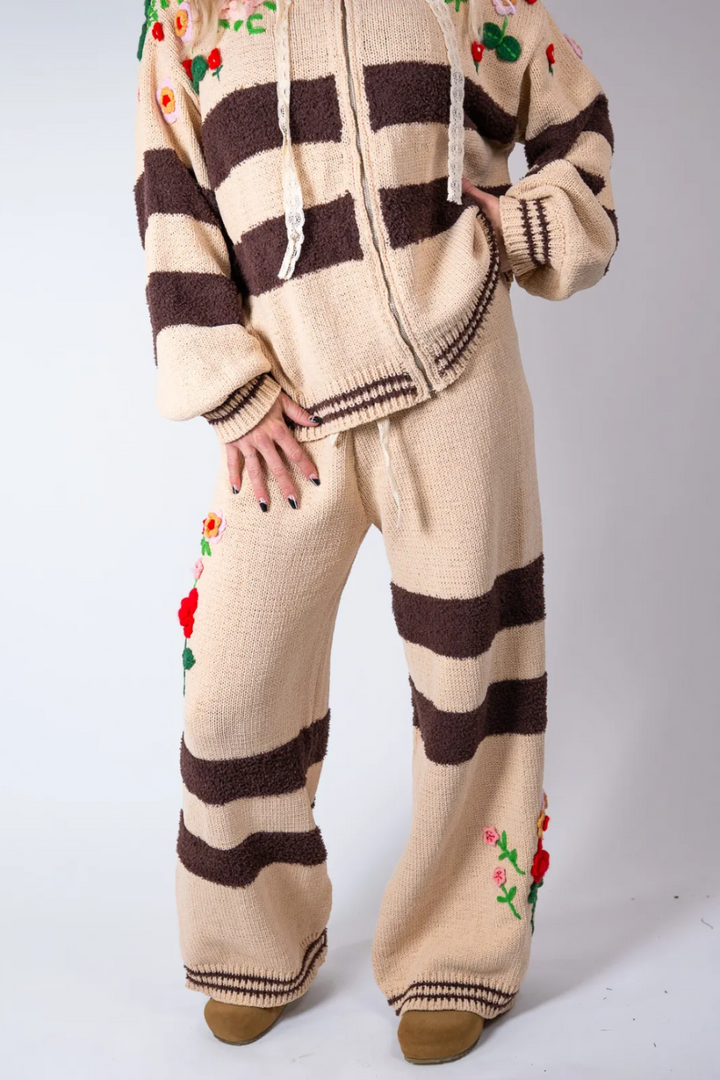 The Whimsy Weave Set feature a cozy tan knit with playful mocha stripes, stitching details, and charming crocheted blooms, bringing whimsical texture and fun to your everyday look.